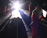 Catch a glimpse of hooded prisoners chained to rooftop shingles,